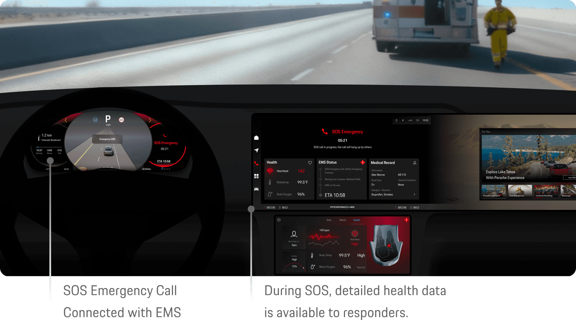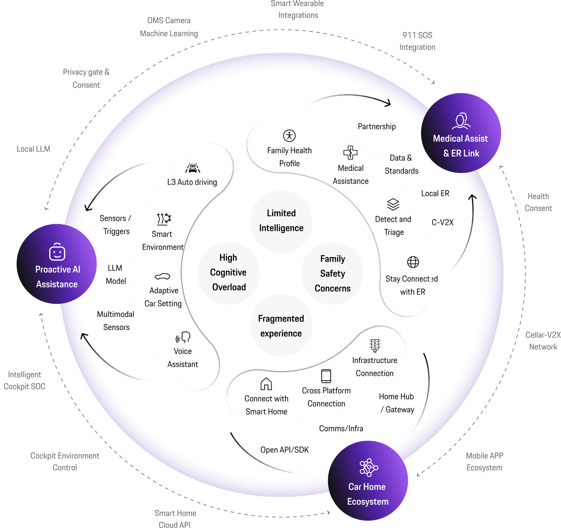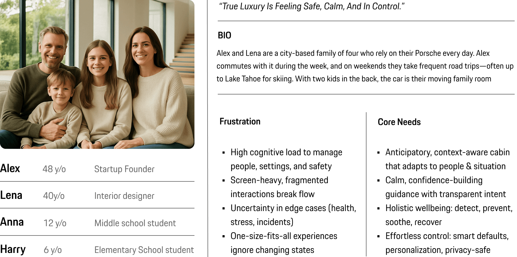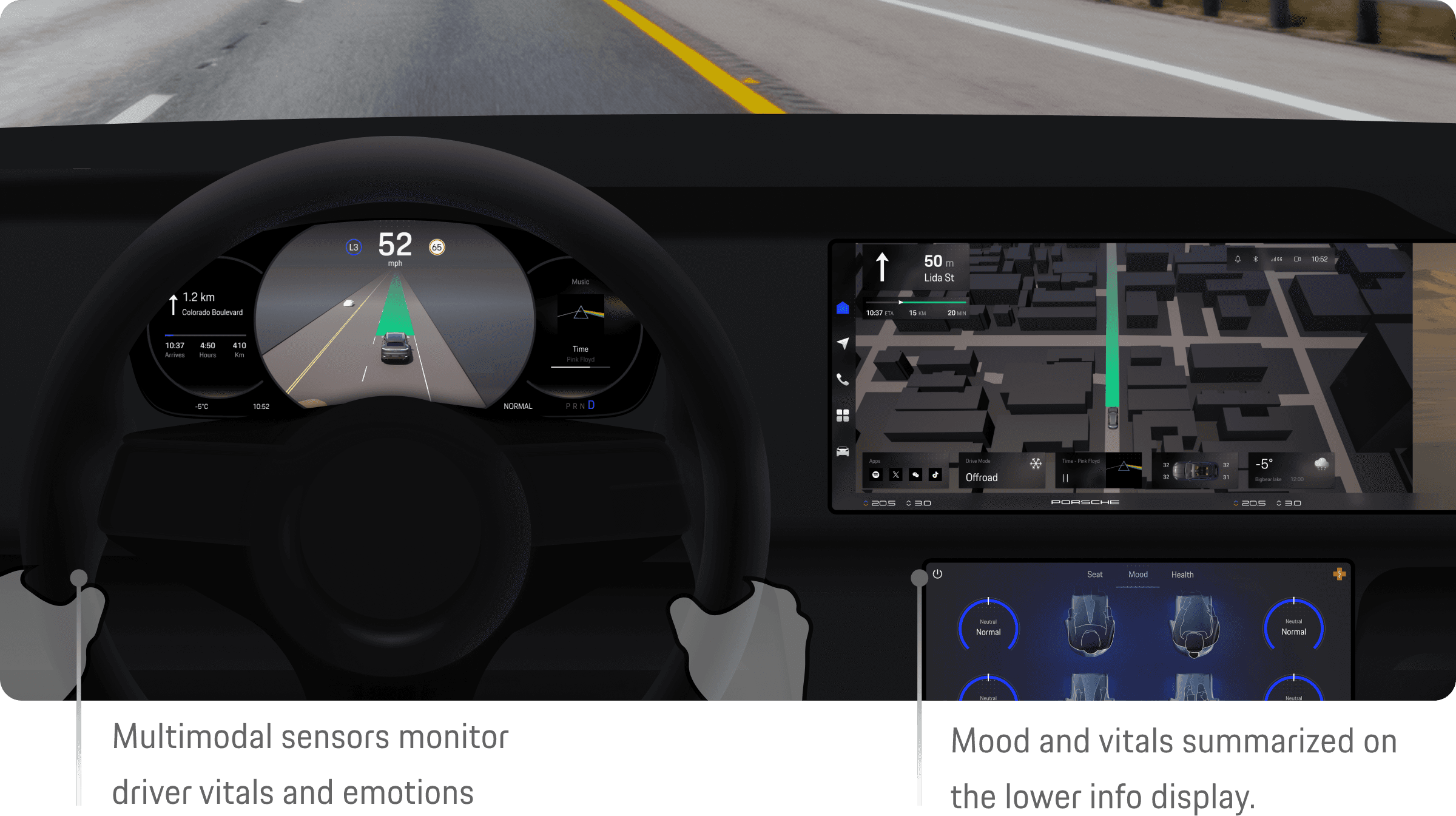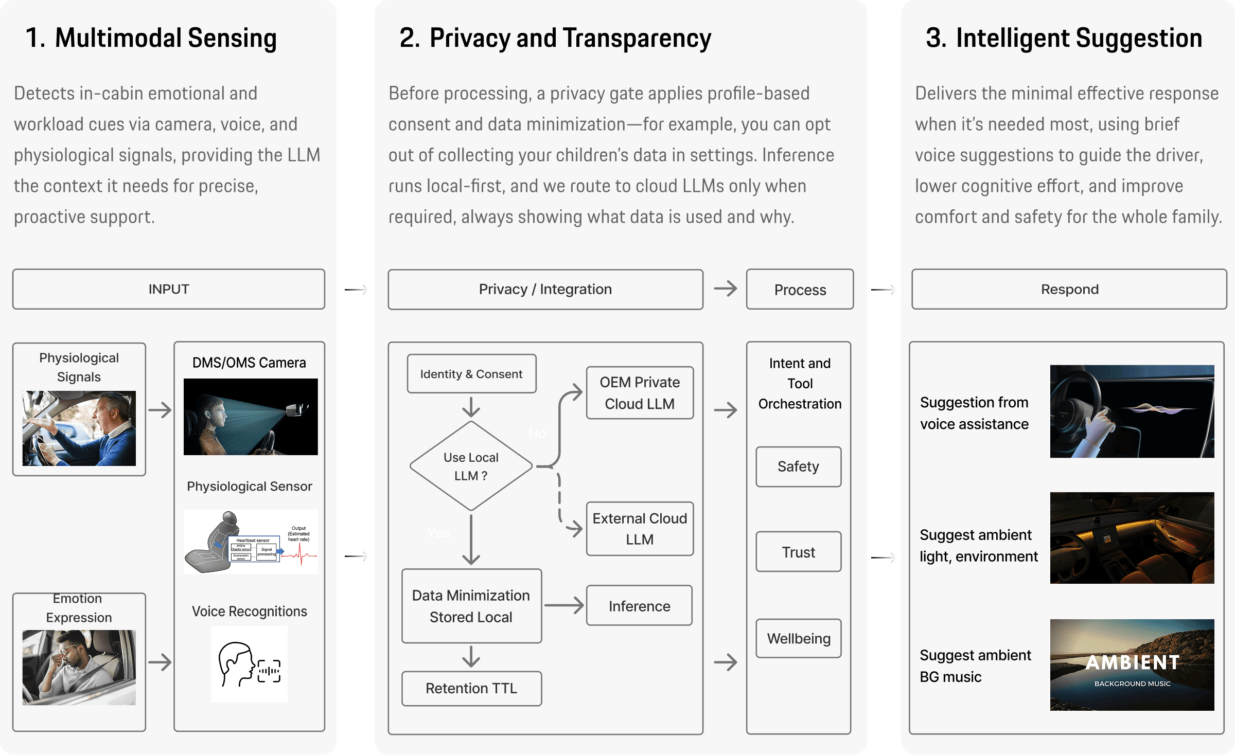 An Automotive Cockpit that harmonizes Porsche’s performance DNA with family well-being. Utilizing multi-modal sensing and proactive AI assitance, the vehicle anticipates passenger needs before they are spoken, from emergency medical response to emotional care, creating a cabin experience that is safe, calm, and intuitively in control.