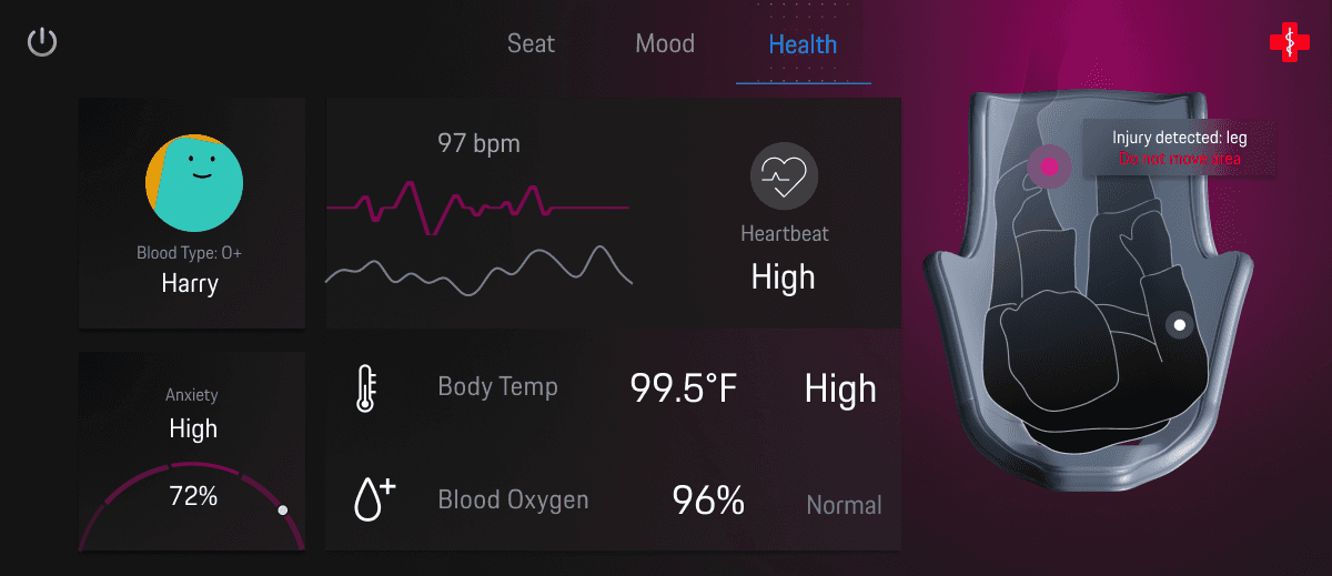 Monitors in-cabin vitals and, if Emergency Mode is activated, notify ER and auto driving to hospital if needed and securely shares real-time vitals and key Family Health Profile details.