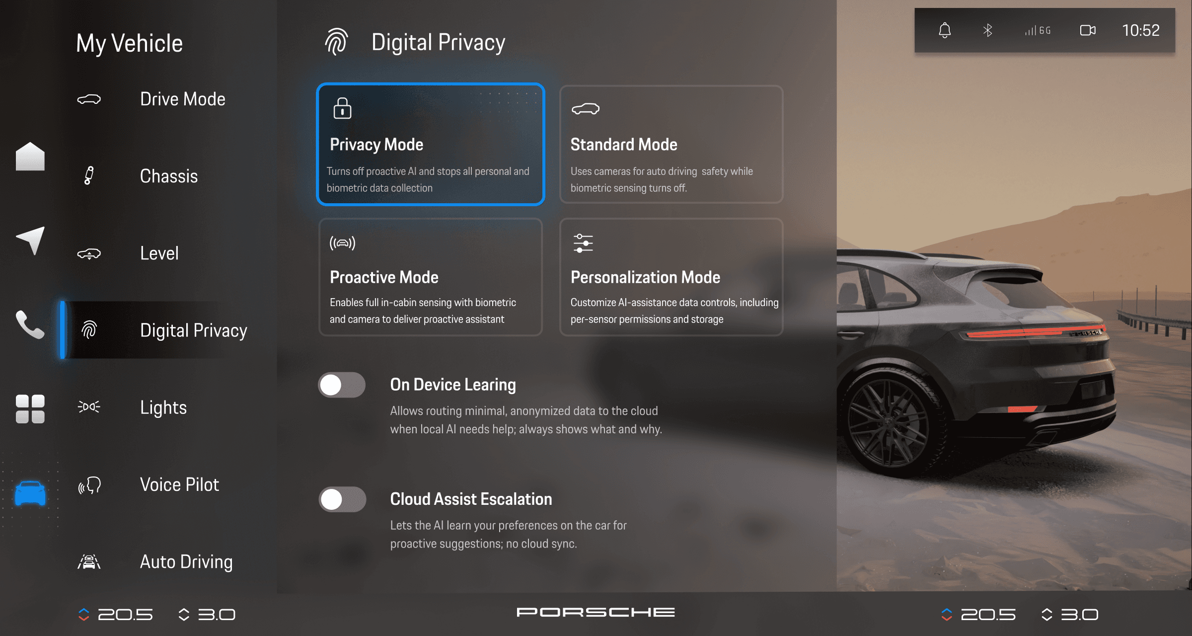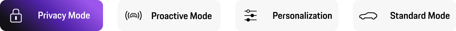 I designed four privacy modes integrated into the car settings. Users can switch among Privacy, Standard, Proactive, and Personalization with one tap, or personalize per seat with precise sensor permissions and data-retention rules.