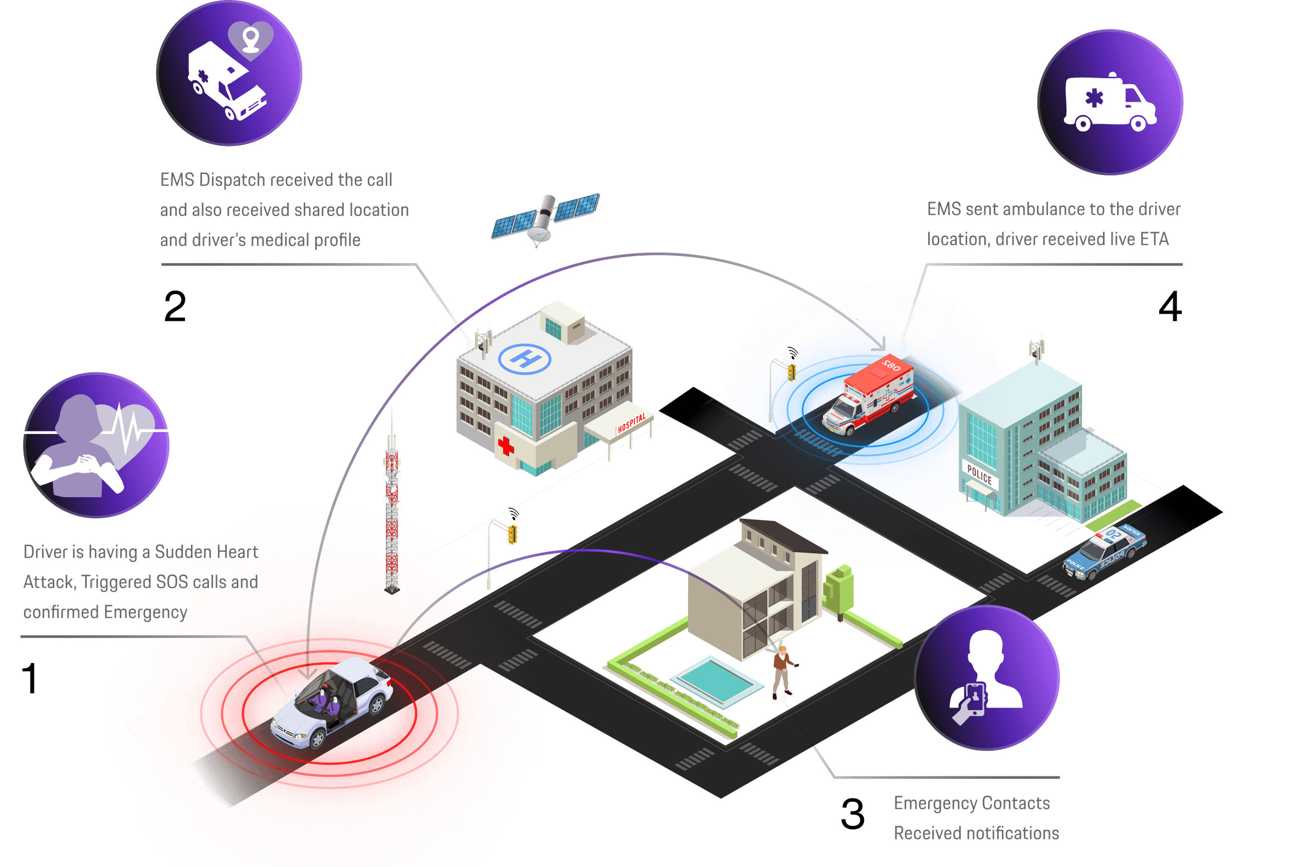 The system operates on a clear three-step logic: it monitors occupant status via sensors, syncs necessary health data to the cloud, and connects directly to emergency services to bridge the gap between detection and rescue