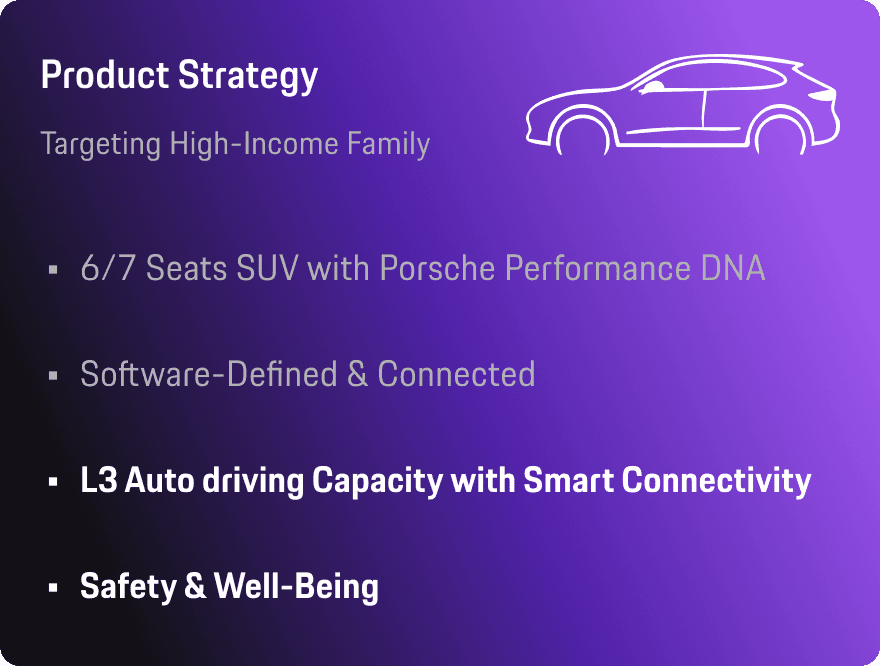 Research shows SUV dominance and rising smart-EV demand; with no three-row EV, we add a Prestige 6/7-seat flagship above the current Cayenne/Macan Lineup and set the strategy below.